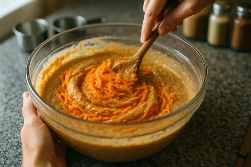 5. Pour the wet ingredients into the dry ingredients and mix until just combined. Fold in the grated carrots (and nuts if using). The batter will be thick.
