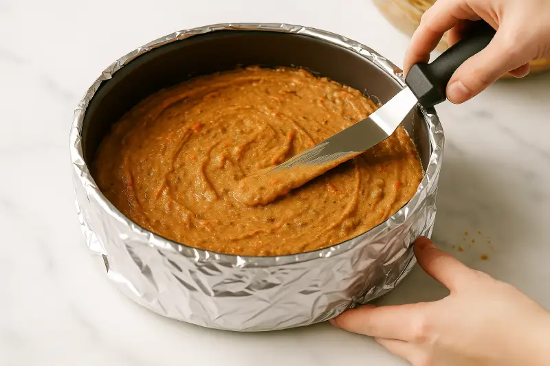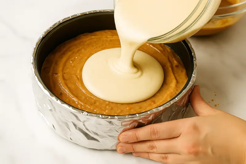11. Gently pour the cheesecake batter over the carrot cake layer, spreading it evenly to the edges.