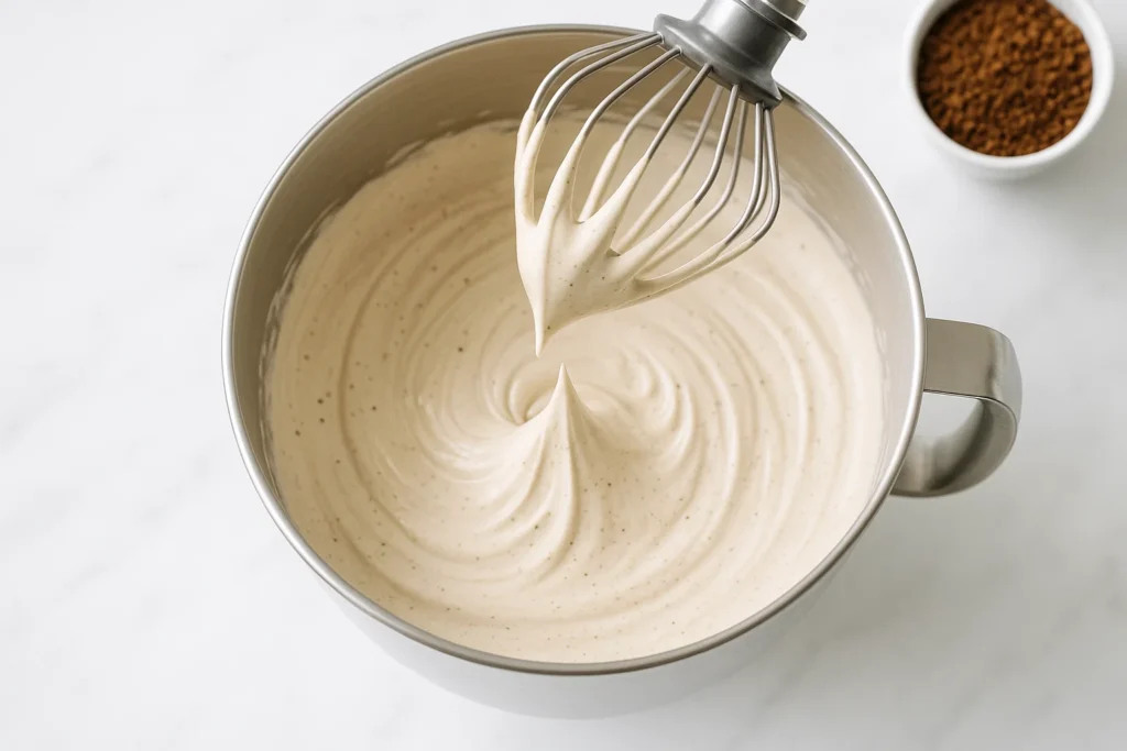 In the chilled bowl, combine the cold heavy cream, powdered sugar, and instant coffee granules. Beat on medium-high speed with an electric mixer until stiff peaks form. This usually takes 2-3 minutes. You’ll know it’s ready when the cream holds its shape and doesn’t slide around when you tilt the bowl. Transfer the whipped coffee cream to a piping bag fitted with a round tip, or use a zip-top bag with the corner snipped off.