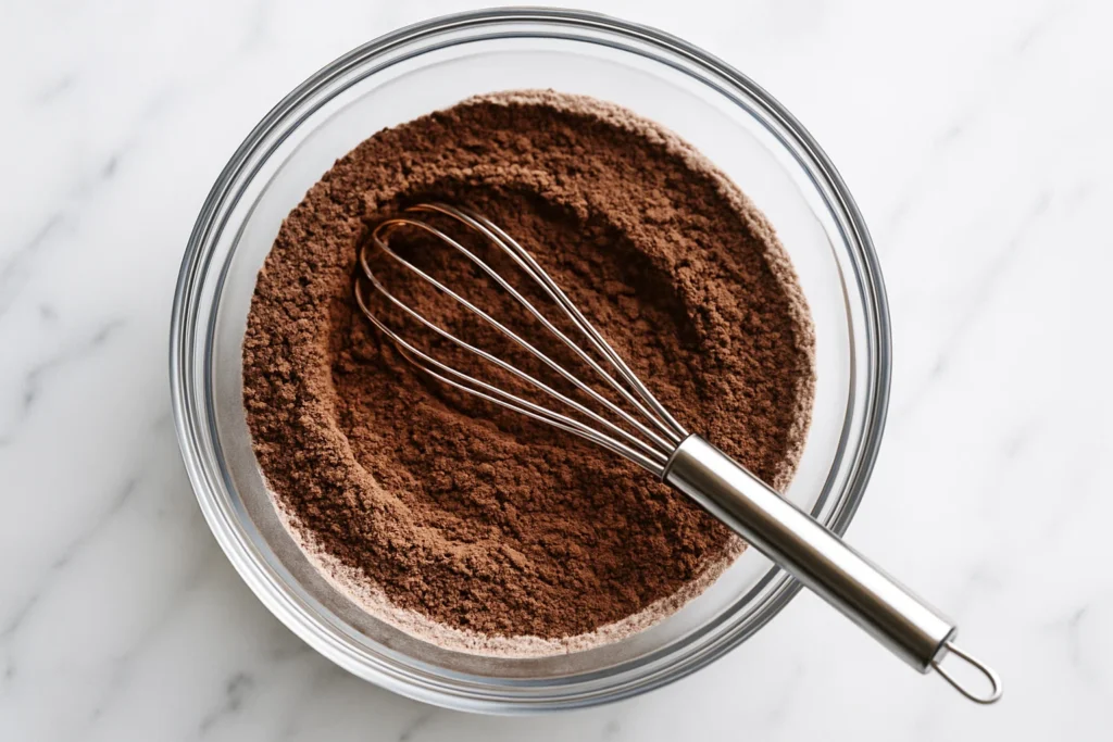 In a medium mixing bowl, whisk together the all-purpose flour, unsweetened cocoa powder, baking powder, baking soda, and salt. Whisk thoroughly for about 30 seconds to ensure everything is evenly distributed and there are no lumps of cocoa powder. Set this bowl aside.