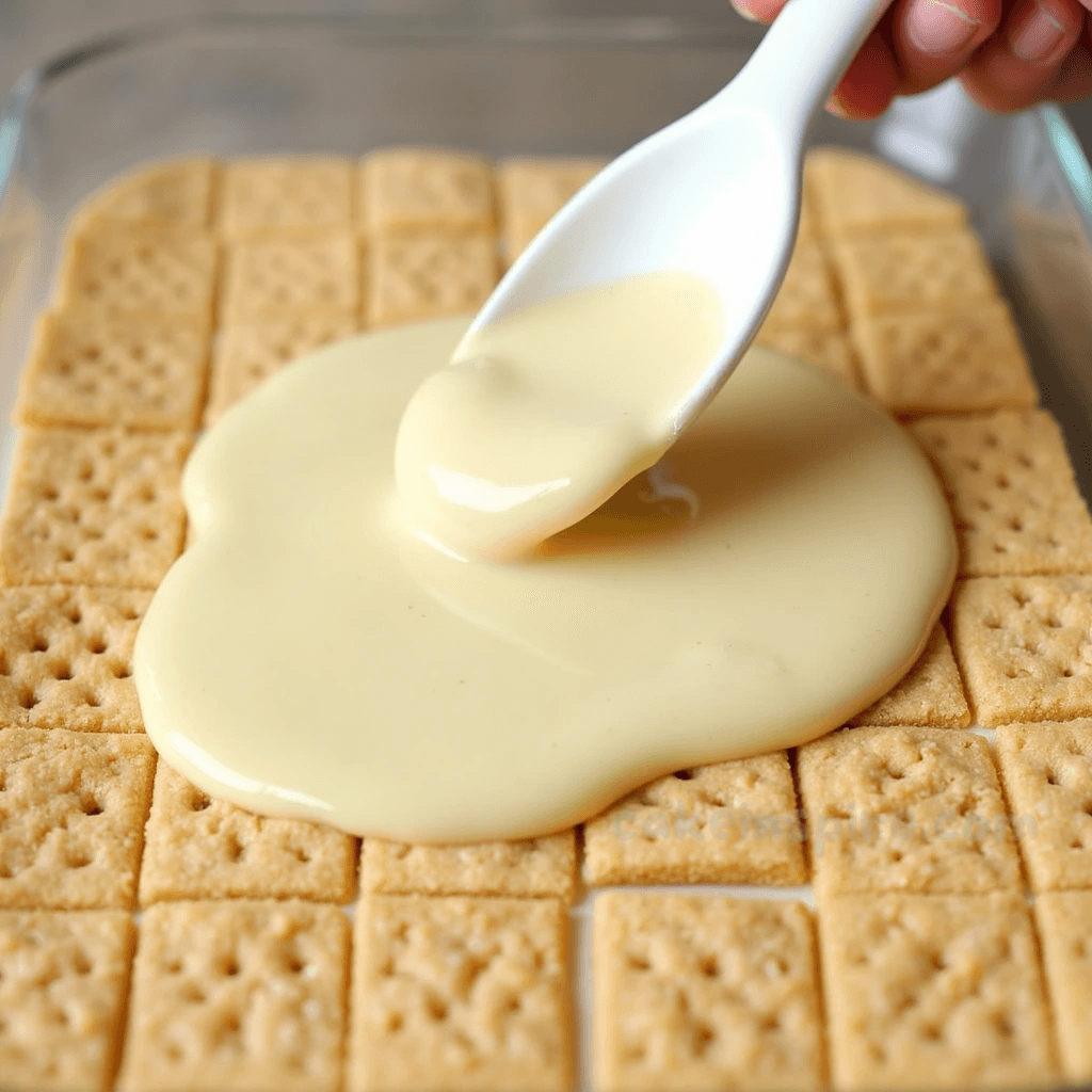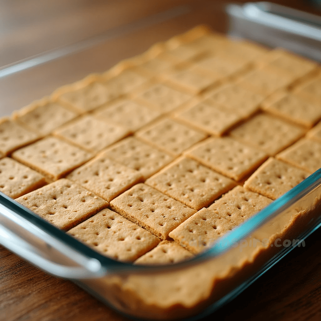 - In a 9×13-inch baking dish, arrange a single layer of graham crackers to cover the bottom.